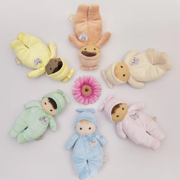 Reflecting their plurality, the Kaloo Tendre Bébé First Baby Doll collection is a harmonious bouquet of tenderness. Each little soft toy doll is associated with a flower and a colour: from Camellia to Mimosa, including the Linen or Pilea, the symbolism of flowers permeates each of the fabric dolls in the range.