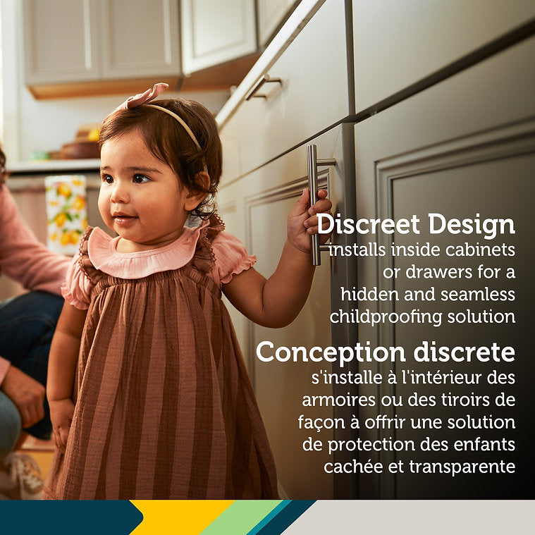 These discreet locks are installed inside cabinets and drawers, keeping them out of sight while providing strong security. The magnetic key effortlessly unlocks the system and can be stored high out of your child's reach for added safety. A convenient push-lever feature lets you temporarily disengage the lock during non-use, while the SecureTech locking indicator ensures the lock is properly re-engaged when needed. With Secure-to-Explore Adhesive Magnetic Locks, you can babyproof your home with ease and confidence, creating a safe environment for your little explorer.