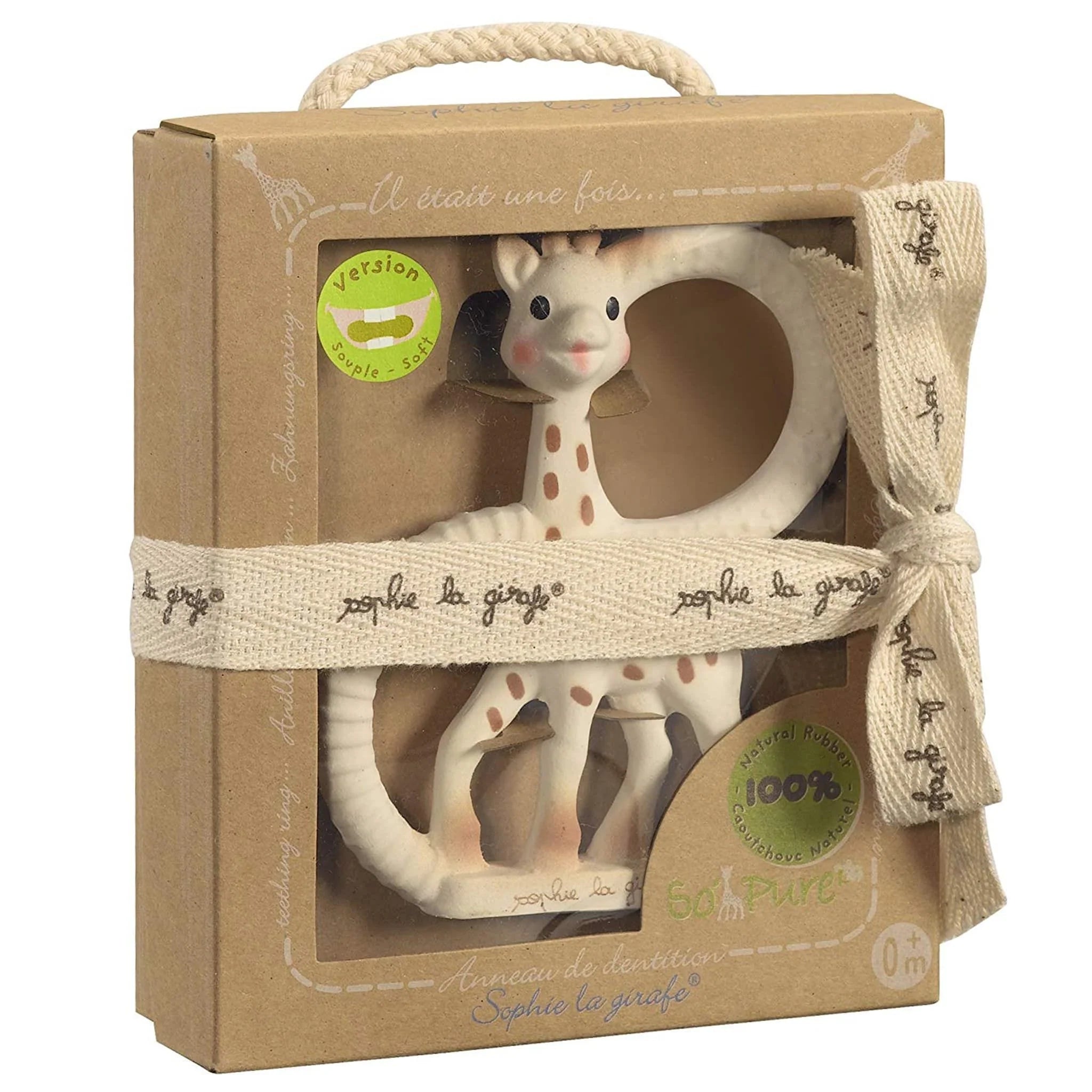 Just like the original Sophie the Giraffe Teether, the Sophie the Giraffe So'Pure Natural Rubber Teething Ring from Vulli is made with all-natural rubber from the Hevea Tree. This super-soft teether with multiple textures and easy-grasp places is visually-stimulating with its high-contrast spots. This beautiful product will help ease the pain associated with sore gums during teething, and help those precious little teeth to pop through. The all-natural Sophie So Pure Teething Ring is also BPA- and phthalate-free.