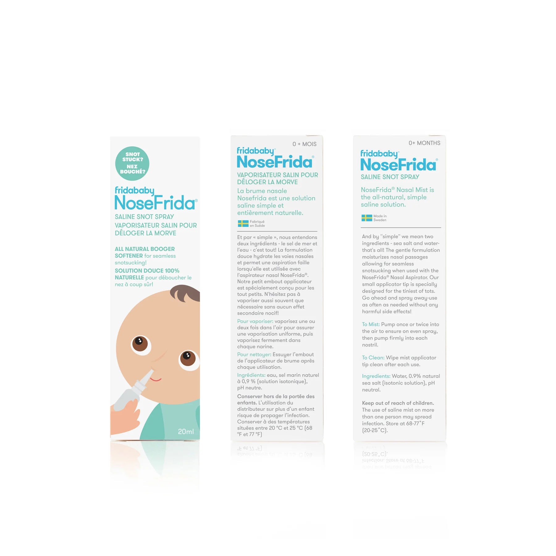 The Frida Baby NoseFrida Saline Snot Spray is an all-natural, simple saline solution. And by simple we mean two ingredients - sea salt and water - that's all! The gentle formulation moisturizes nasal passages allowing for seamless snotsucking when used with the Frida Baby NoseFrida Nasal Aspirator. Our small applicator tip is specially designed for the tiniest of tots. Go ahead and spray away - use as often as needed without any harmful side effects!