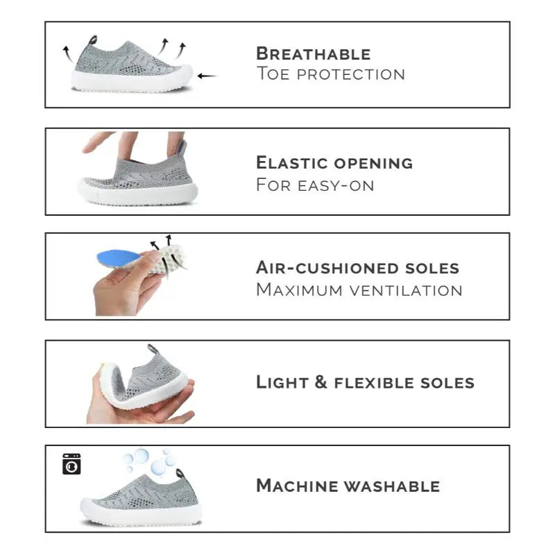 During the summer heat, this shoe outshines the rest! Perforated Breeze knit design not only gives this shoe a stylish look but also maximizes air flow all around your child’s feet. Air-cushioned & cotton-lined EVA insoles offer extra breathability from underneath and provide shock absorbent comfort.
