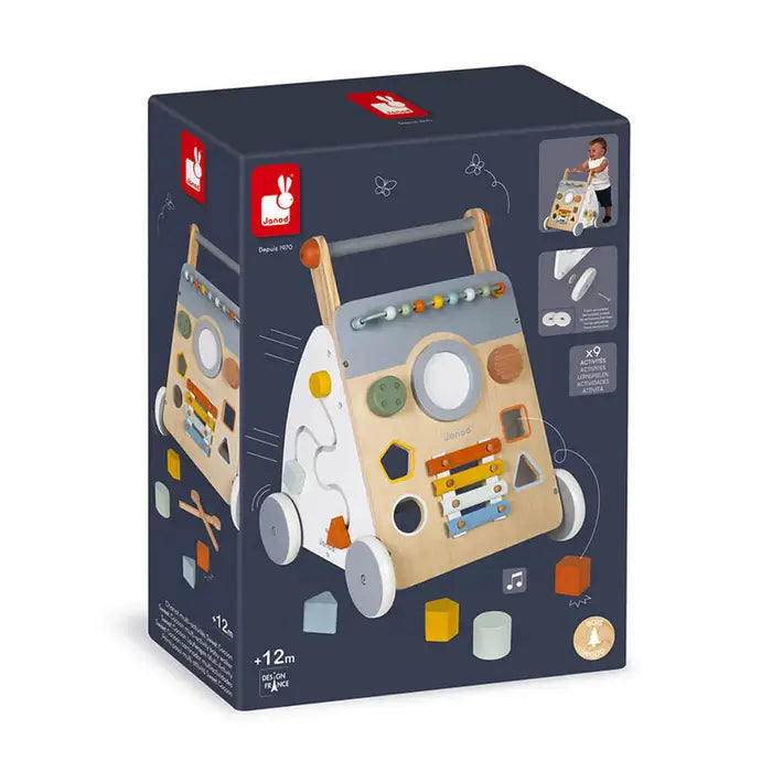 The beautiful Janod Sweet Cocoon Multi-Activity Baby Walker push-along trolley is great for helping children learn to walk. It’s suitable for children aged 12 months and over, and comes with an invisible, removable brake that allows you to stop and release the wheels as required, so you can control the speed of the trolley as your child learns.
