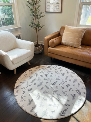 Our round floor mats are 4.5ft in diameter and 1.5 cm thick (0.6 inch). They are super easy to clean and are vacuum safe. They can also be rolled up for storage when not in use.