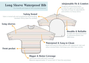 The Loulou Lollipop Long Sleeve Waterproof Bib is made with 100% eco-friendly recycled polyester with TPU coating that is waterproof, stain, and odour resistant, and is Standard 100 by Oeko-tex certified. Designed with an adjustable neckline with snaps and elasticized cuffs to allow for a comfortable fit that grows with baby to toddler - from 6 months to 3 years old. Generously sized with excellent coverage and protection.