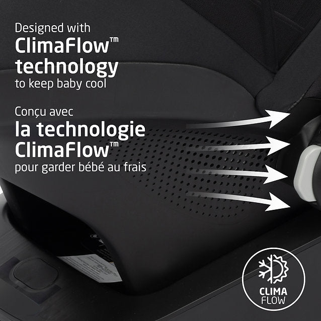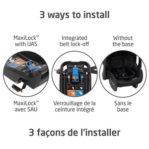 The intuitive base installation features MaxiLock™ technology with red-to-green tightness indicators, a 3-position adjustable base, a self-tightening UAS system, and a load leg which adds stability and limits movement in the event of a collision. Taxi-mode is simple and convenient with large, visible belt guides that show how to position the belt without using the base.