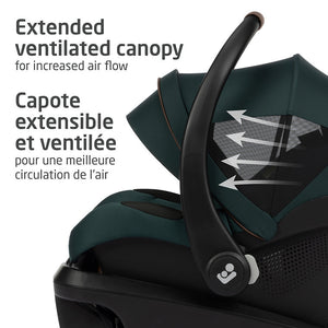 Your baby’s safety and comfort come first. The ClimaFlow™ technology shell provides added ventilation to keep your baby cooler. Side impact protection and plush padding on the removable infant head and lumbar inserts ensures a secure fit and cozy ride. Plus, energy absorbing EPP environmentally-friendly foam in the headrest area to effectively manage impact energy. The extendable ventilated canopy provides maximum shade and airflow. Enjoy added style and comfort with the vegan leather-trimmed ergonomic carrying handle contoured to curve around your hip.