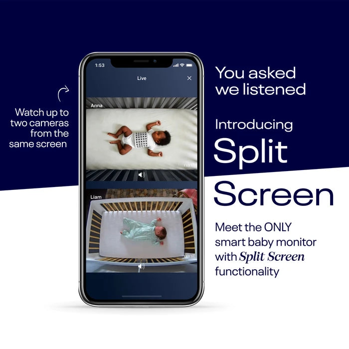 • the only smart baby monitor with a Split Screen feature that allows users to see + control two cameras simultaneously in app