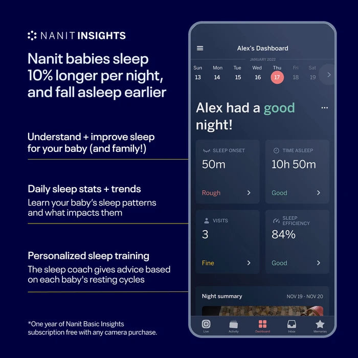 The Nanit Pro Camera + Flex Stand offers maximum portability at a great price by pairing the Nanit Pro Camera—the world’s only smart baby monitor with computer vision technology—with the Flex Stand, allowing you to move your camera from room to room or take it with you on the go (think playdates, backyard fun, travel, other caregivers’ homes) to get a 130° view in seconds. That means you can monitor your baby and capture those unmissable moments–anywhere, any time.
