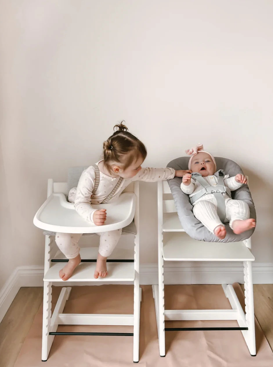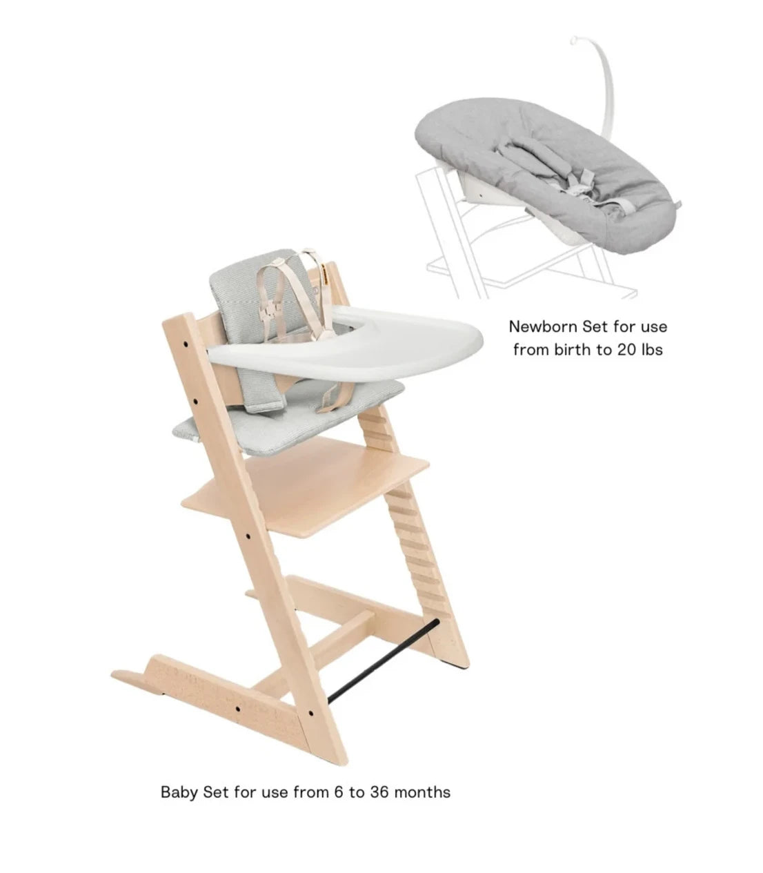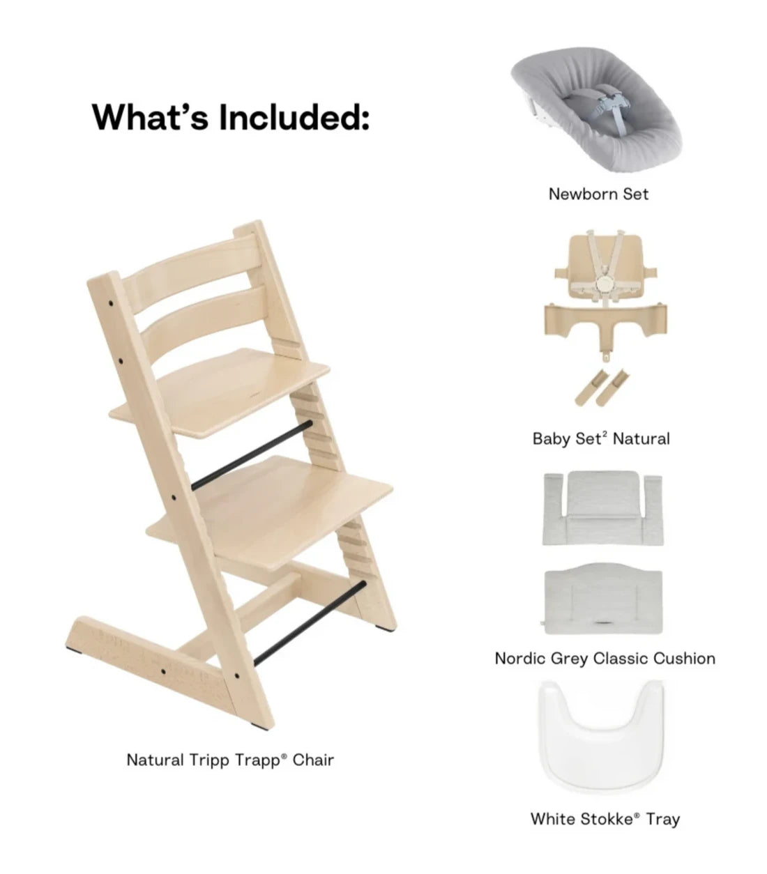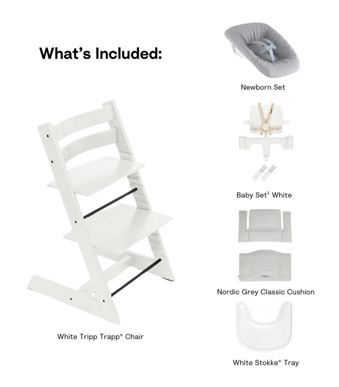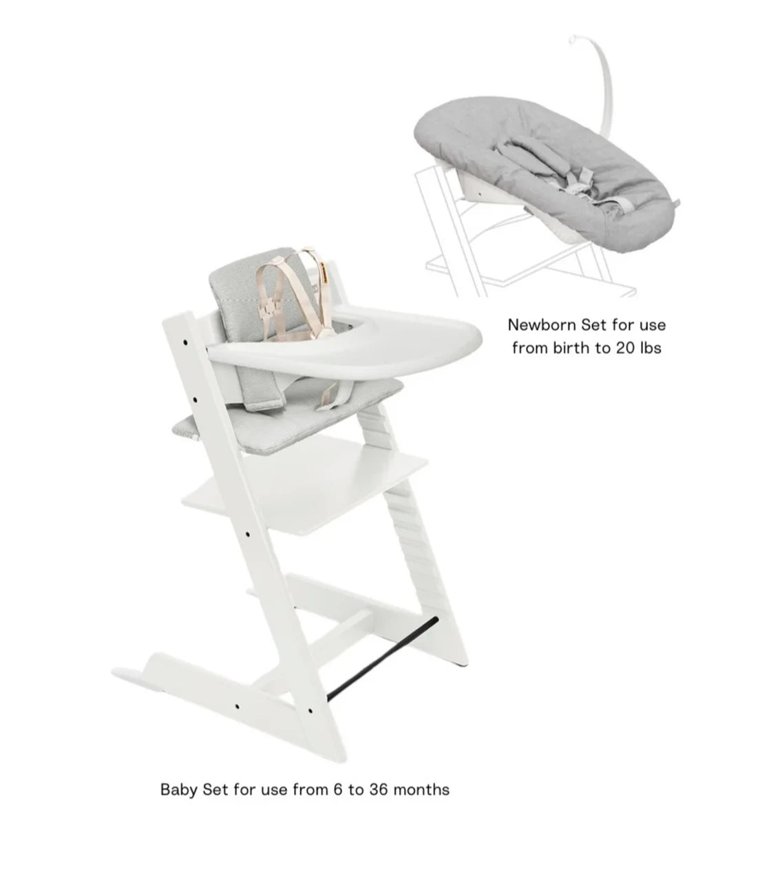 • this complete high chair bundle includes everything you need to use the Tripp Trapp with a baby: the Newborn Set, Tripp Trapp Chair, Baby Set² with new Stokke Harness², Food Tray and Classic Seat Cushion²