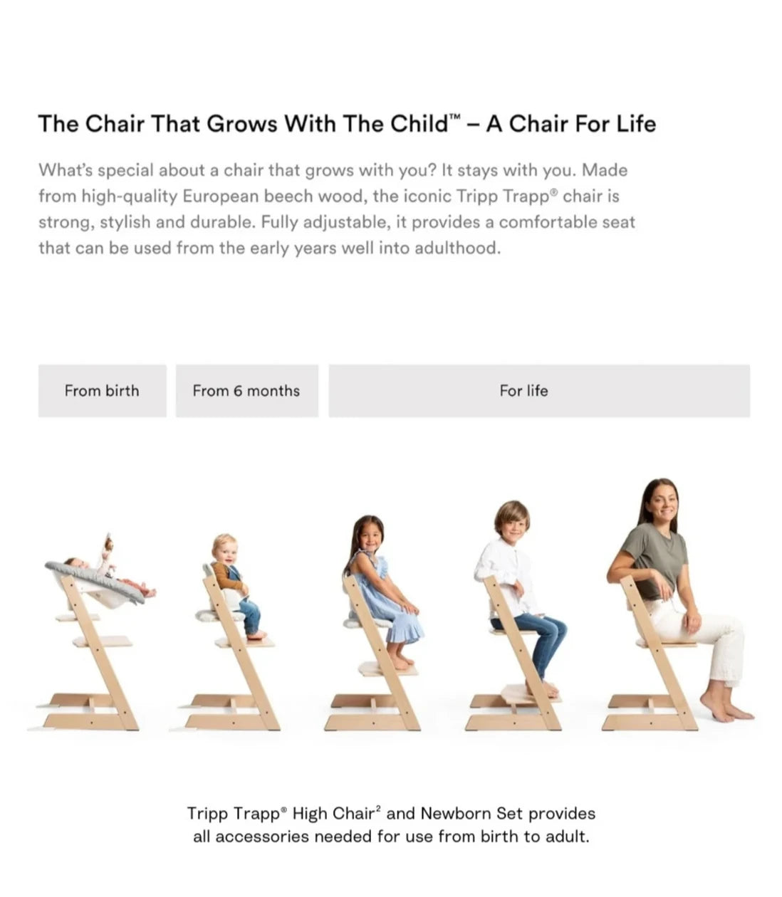 The chair that grows with the child.™ A classic since its release in 1972, the Stokke Tripp Trapp® is the chair that fits your child—and your decor, too. Constructed of solid European Beech, Oak or Ash wood, the Stokke Tripp Trapp is a timeless alternative to plastic-based high chairs you'll use only for a couple of years. With the Tripp Trapp, your child can enjoy meals right at the dinner table with the rest of the family. The Tripp Trapp can support up to 300 pounds, growing with your child from infancy to adolescence.